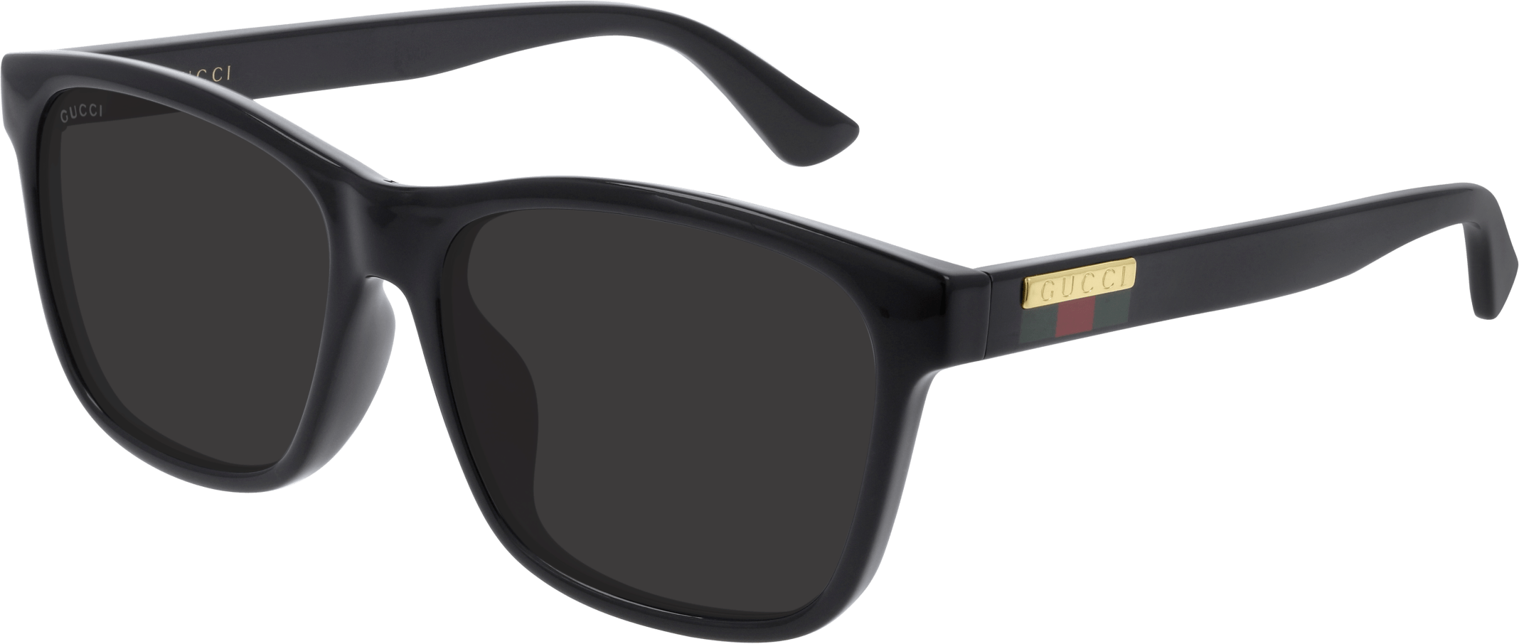 Gucci lettering logo on gold metal plaque and Web detail on temples.