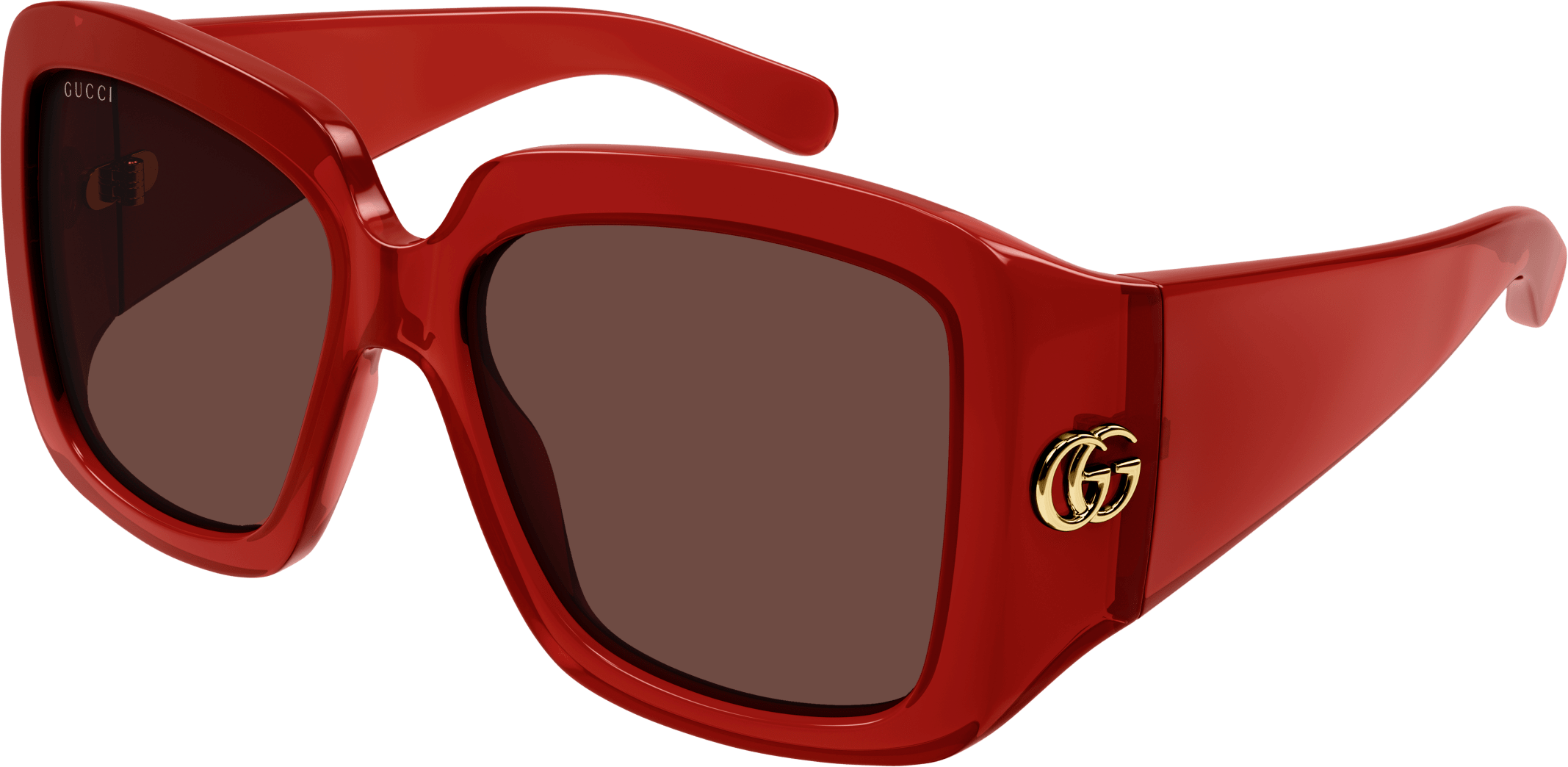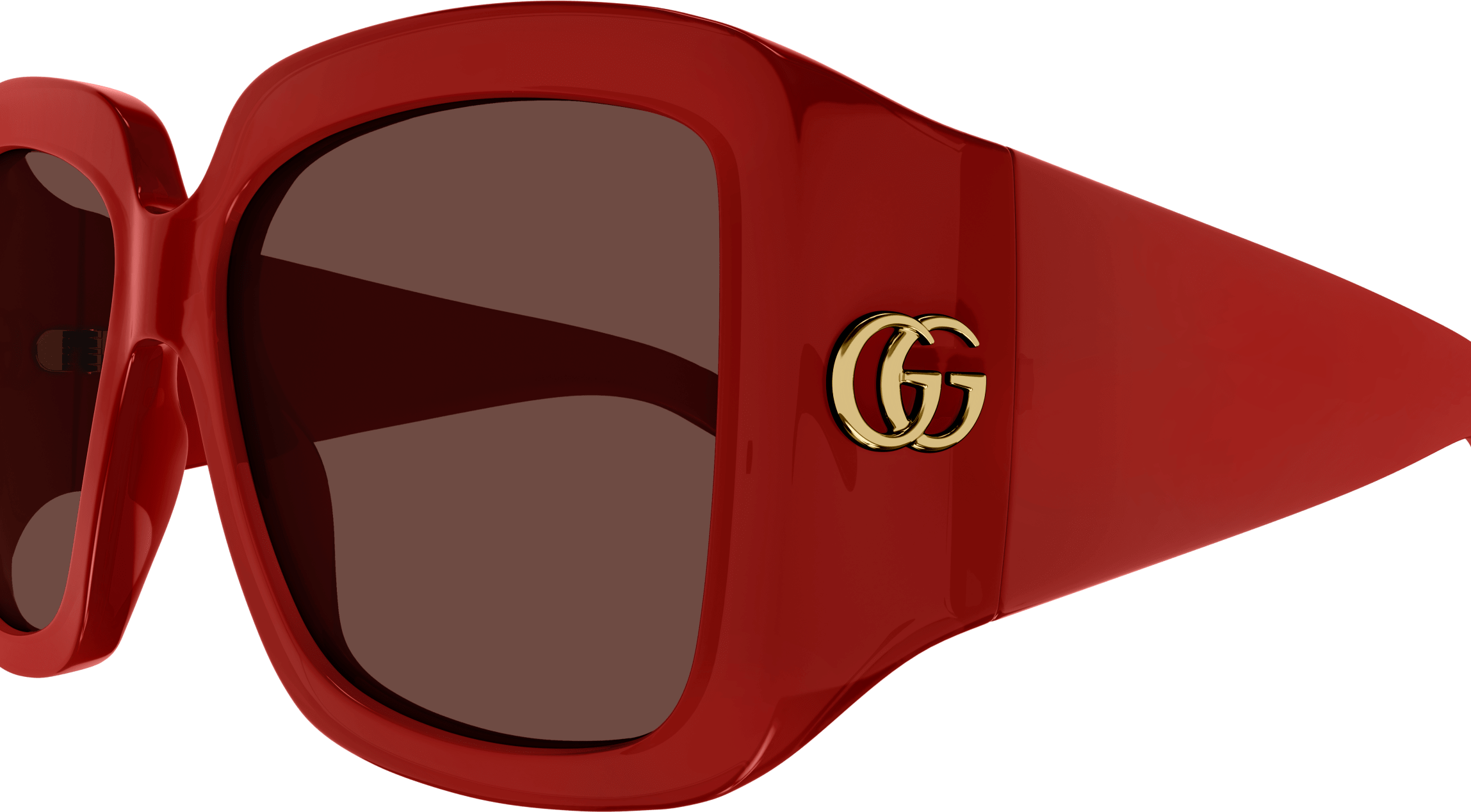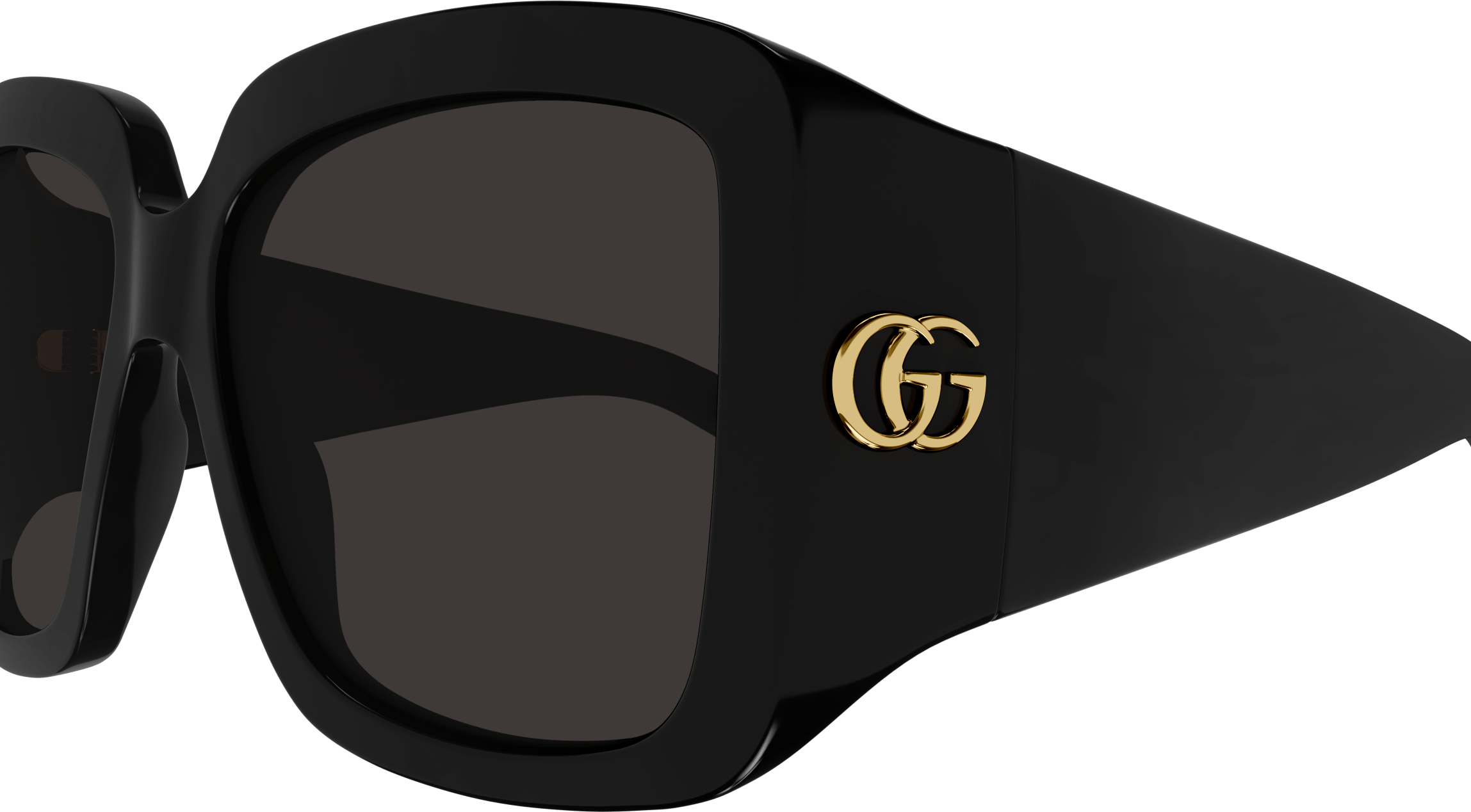 For a modern and feminine look the GG Corner concept is embellished by multifaceted injected construction that makes it unique and timeless. Squared oversize feminine shape in bold acetate. Gucci running logo on the side view. The color palette includes commercial feminine and timeless shades with on top an ivory sku.