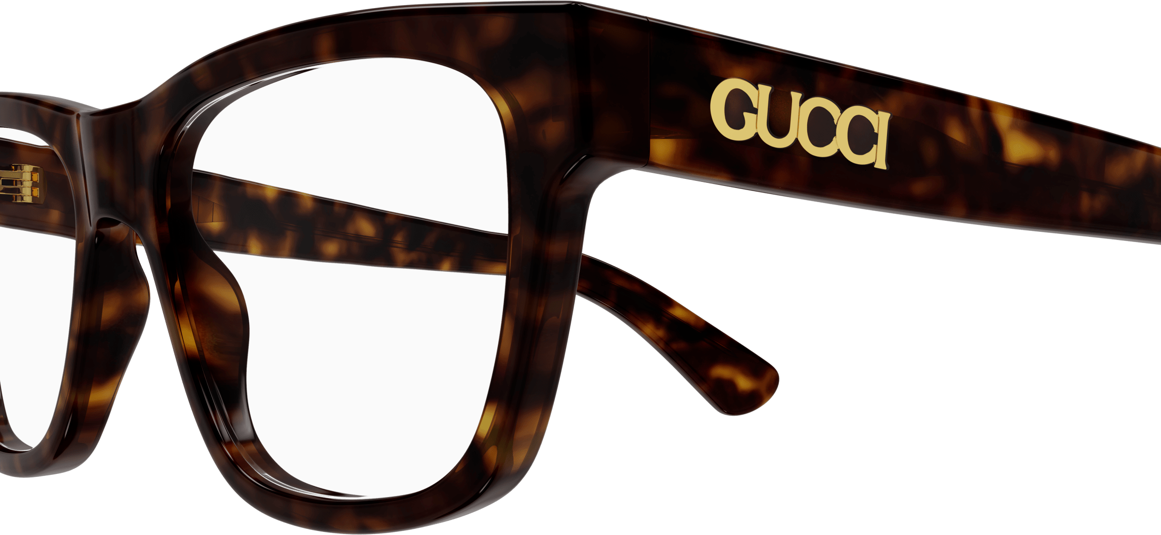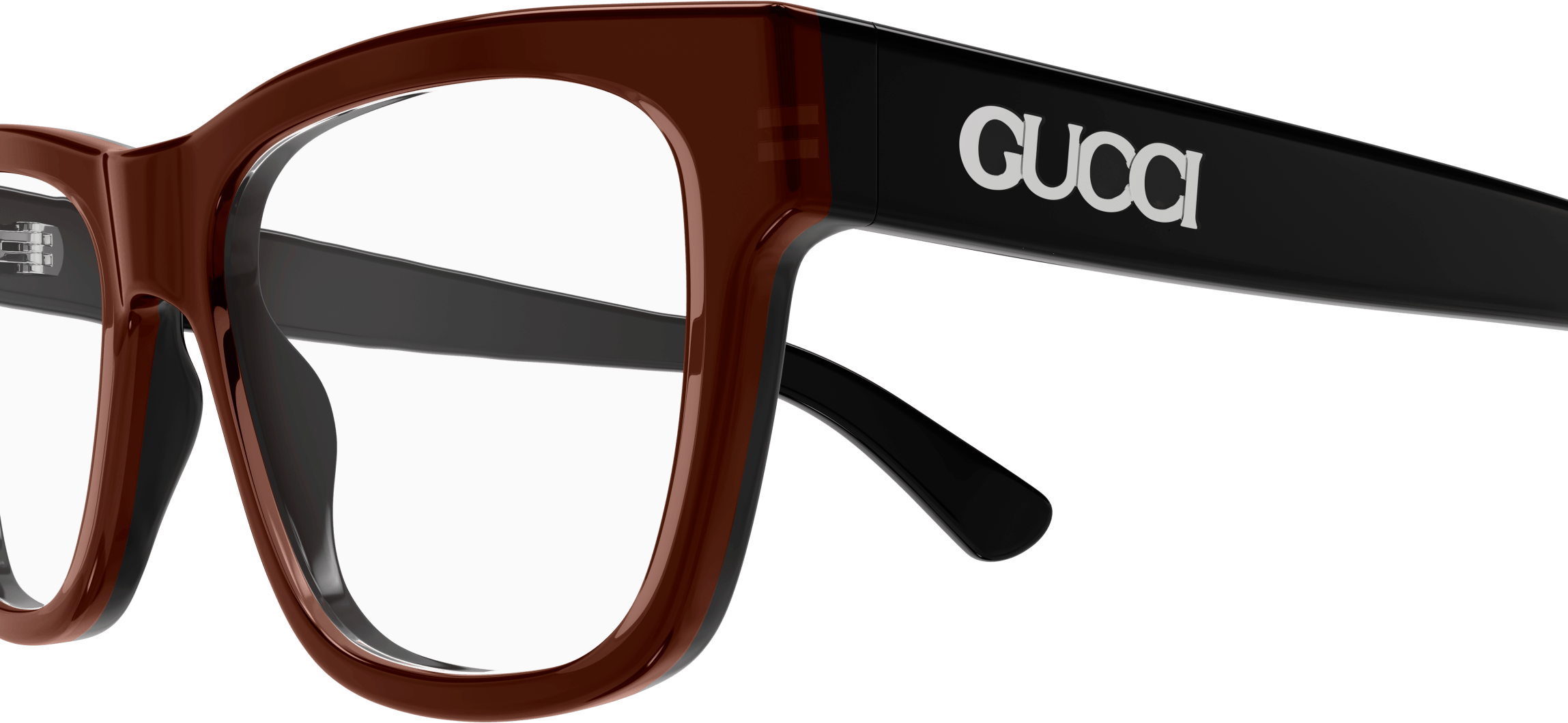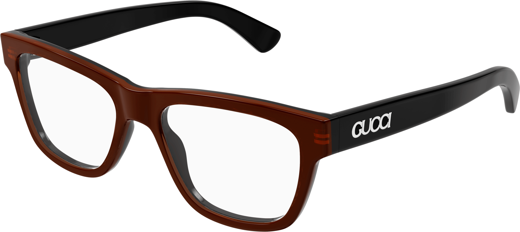 Acetate styles with a bi layered color effect which guarantee a cool look and feel. Rectangular shape. Gucci lettering logo placed under the laque of the construction. Commercial yet cool color palette featuring at least two color combinations.