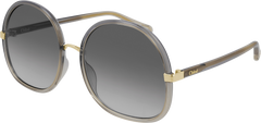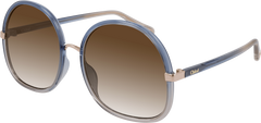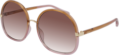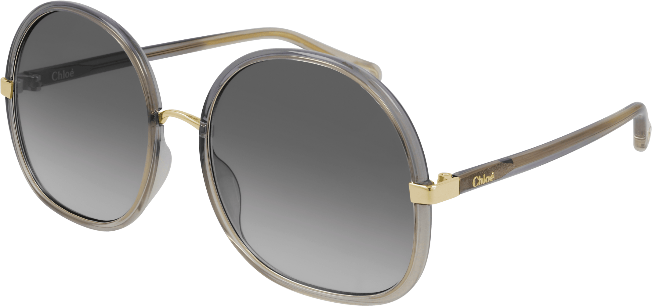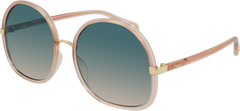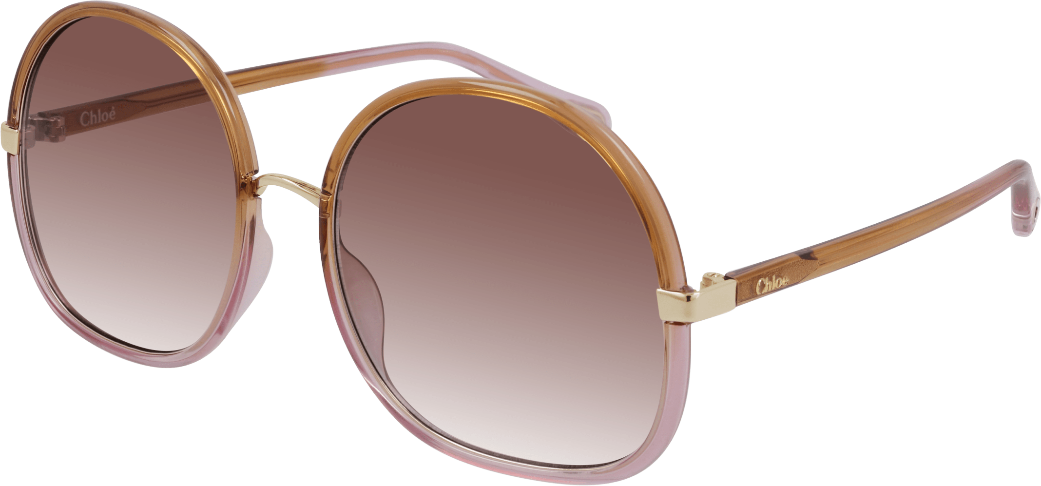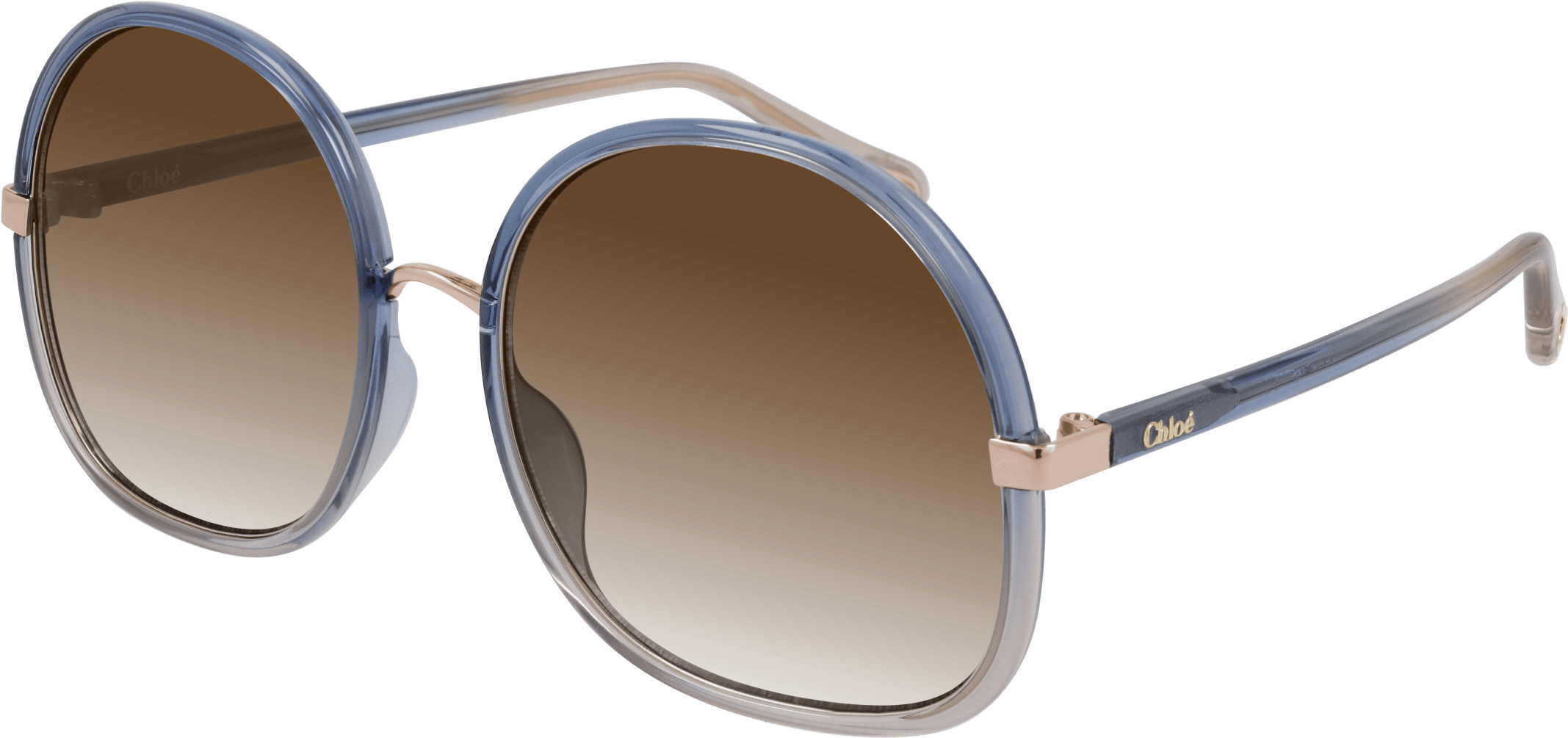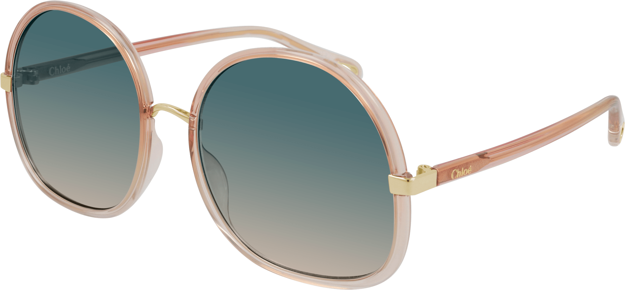 Oversize 70's inspired round metal frame with injected rainbow coloured rims and gradient lenses and temples. Metal nose bridge and metal gold griffe that liaise the front rim to the temple which have an hot stamping logo on the left one. Iconic signature teardrop cutout serving as an aesthetic and functional way to attach the Chloé eyewear jewelry at the end of the temple tips, enriched with the logo engraved.