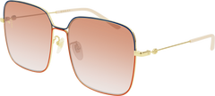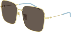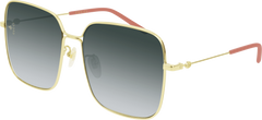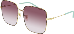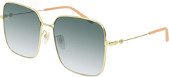 Oversize squared ultralight metal shape inspired from the 70s & 80s. Minimal construction embellished with Gucci small GG interlocking logo combined with Gucci lettering logo and Bumble bee on lenses. Gold metal in contrast with pastel color plastic pastel tones temples tip. Sophisticated and delicate color palette with Web and Sylvie tones on sku 005.