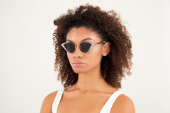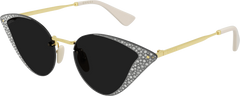 Concept originally launched in SS17 Fashion Show and relaunched in 2021 with precious and eclectic styles dedicated to a stylish and detail-loving woman. Extra pointy cat-eye in metal enriched with crystals applied by hand. The style is completed by contrasting ivory end tips. Gucci Lettering logo on temples. The style is available with classic solid grey lenses and glamorous crystals.