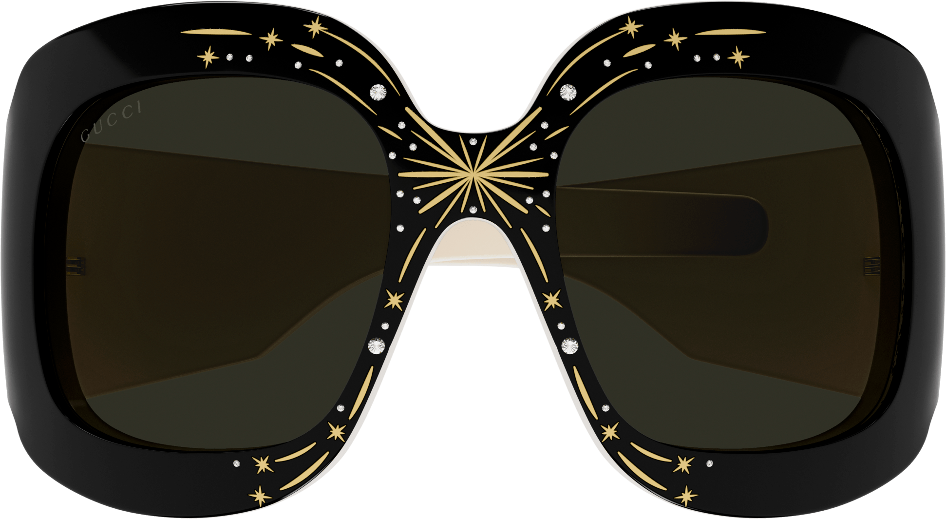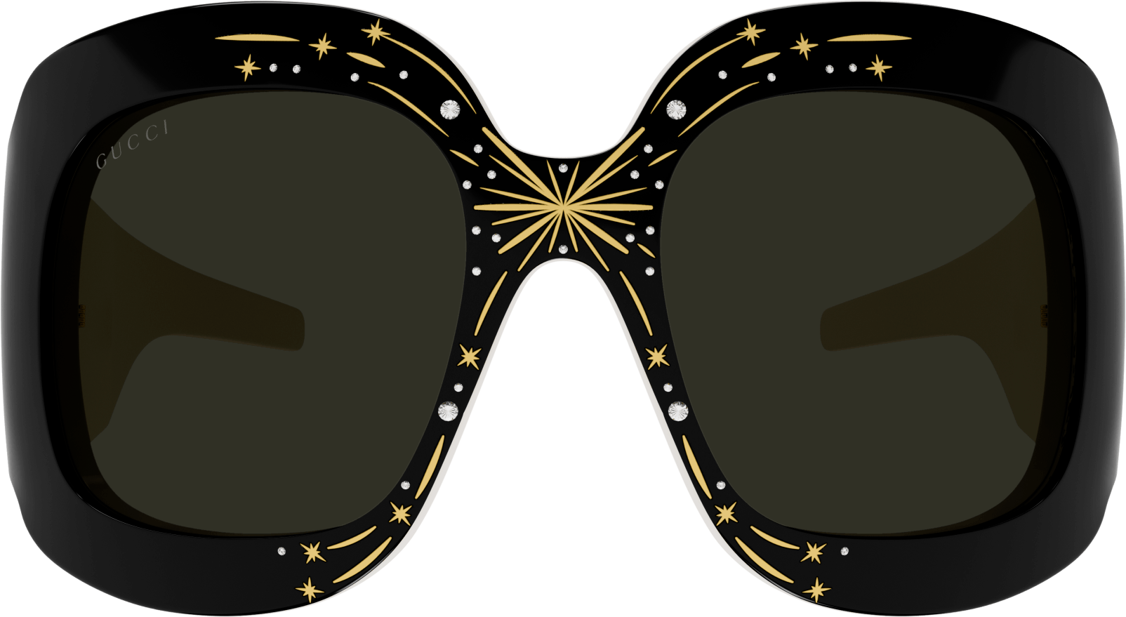 Parties, sequins, champagne and glamour! Hold that feeling because it’s the aim of this part of our collection. Rhinestones and crystals are very important in Alessandro Michele’s aesthetic. This time we’ve stolen one of the most precious techniques from high jewelry to fix diamonds - the pavé. Thousands of little crystals, closely set next to one another, are placed by hand on lenses and acetate to make everyone’s face shinier and shinier. This style is a bold and enveloping mask with the temples enriched with rhinestones and streamers with the GG interlocking logo in the middle. The particularity here is that this is not just a pair of sunglasses, but it turns into a prefect headband.