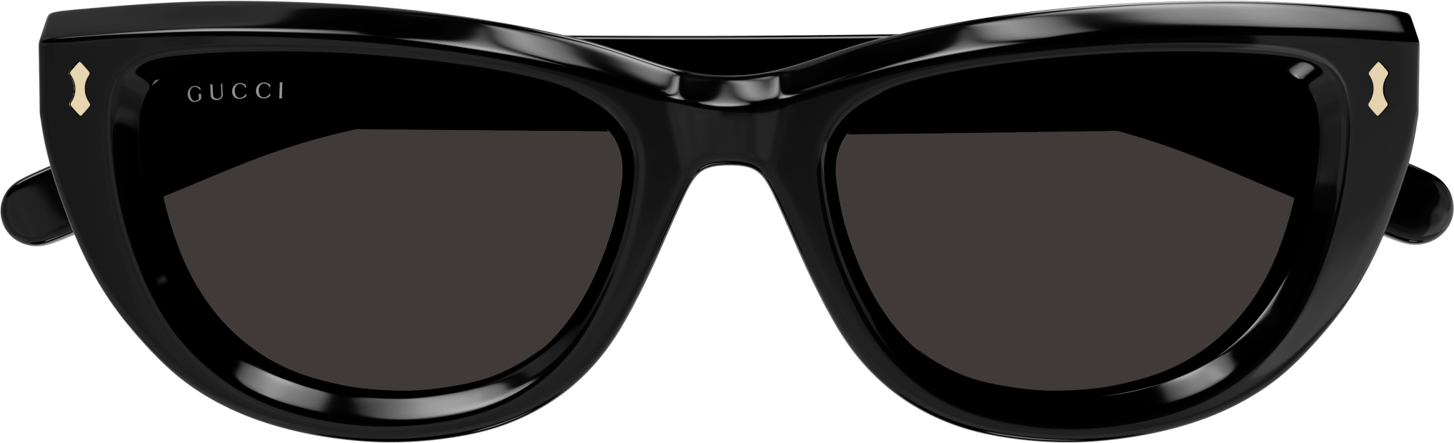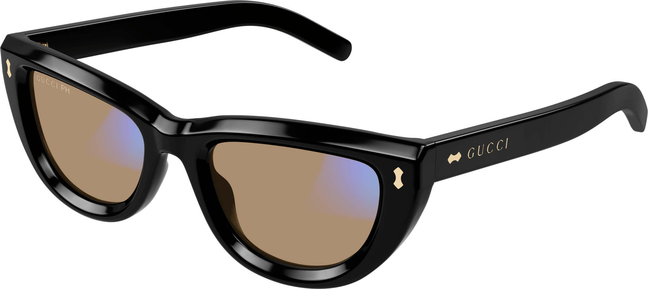 Timeless and elegant acetate construction embellished through the iconic Gucci rivets. Cat eye shape in acetate. Gucci lettering logo on the temple. Commercial yet unique feminine color palette with a unique B&B photocromic lens.