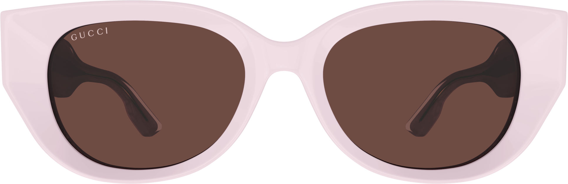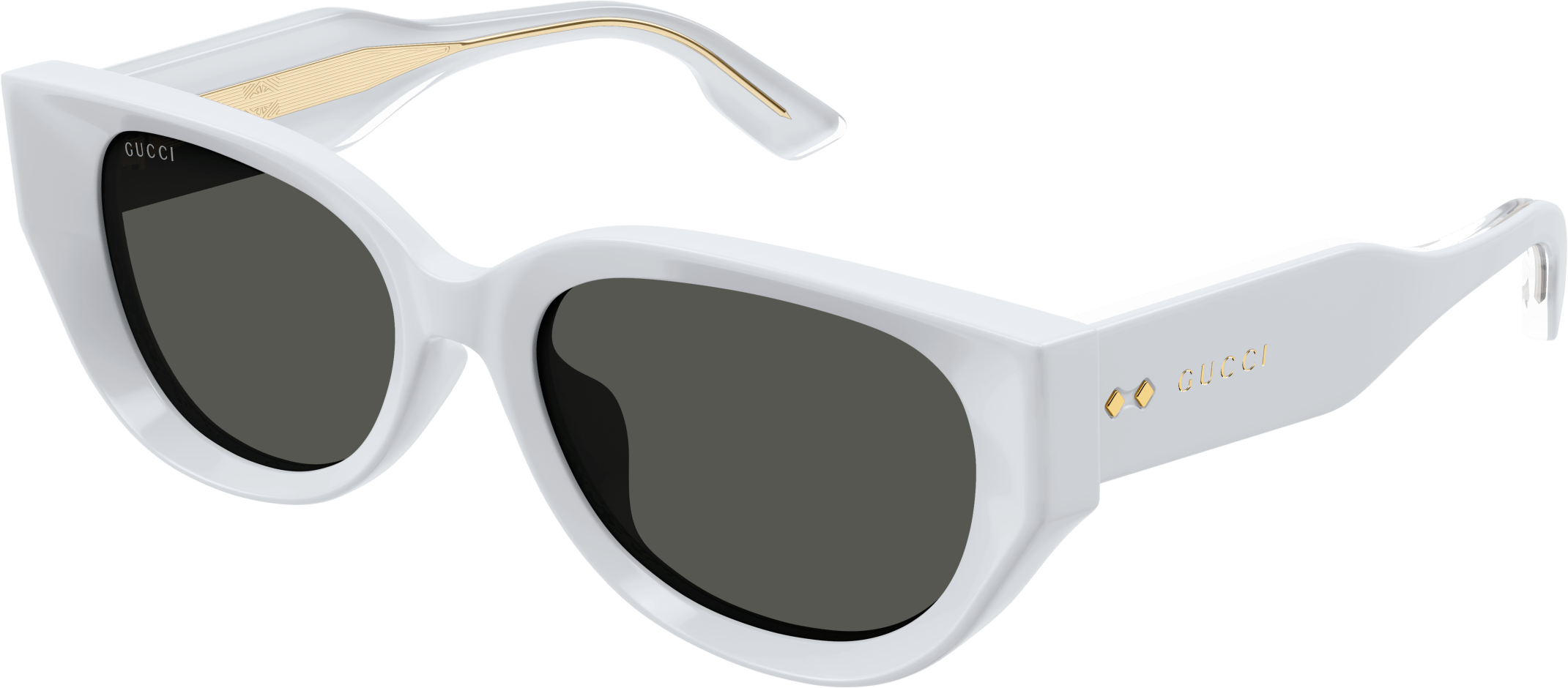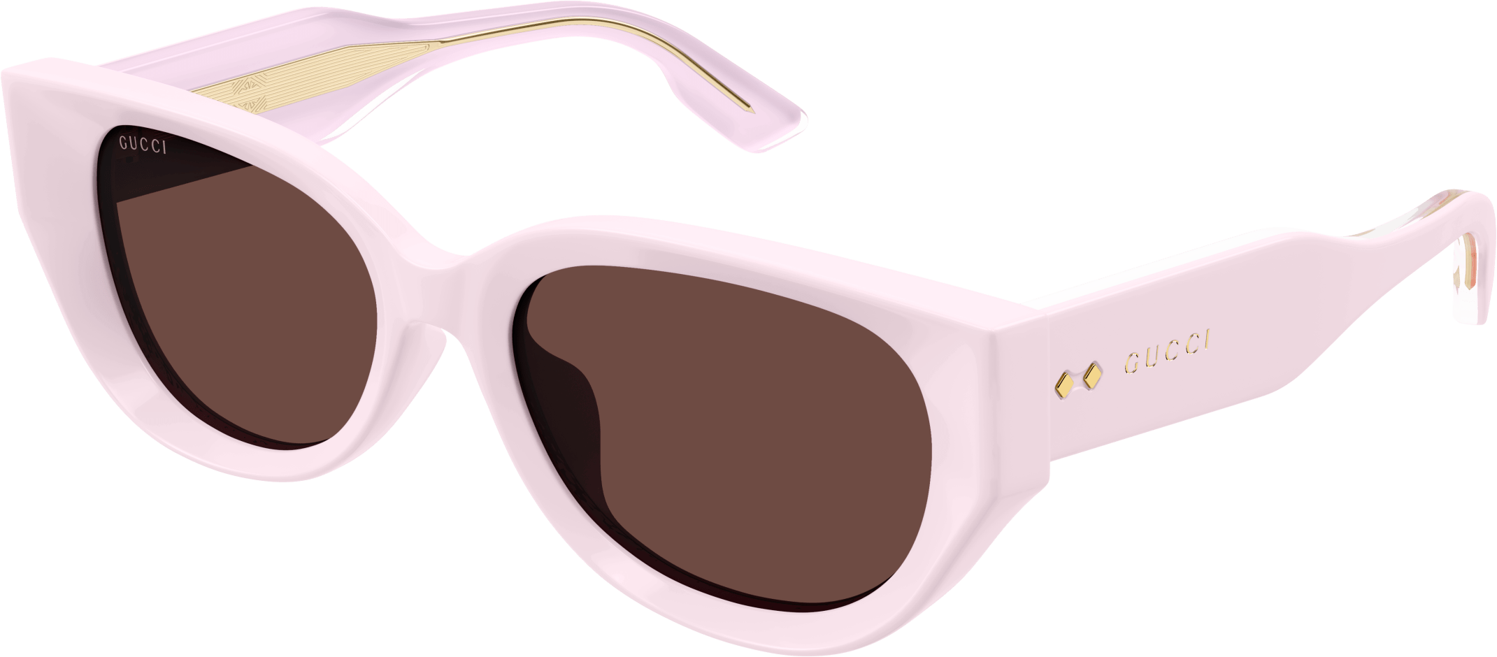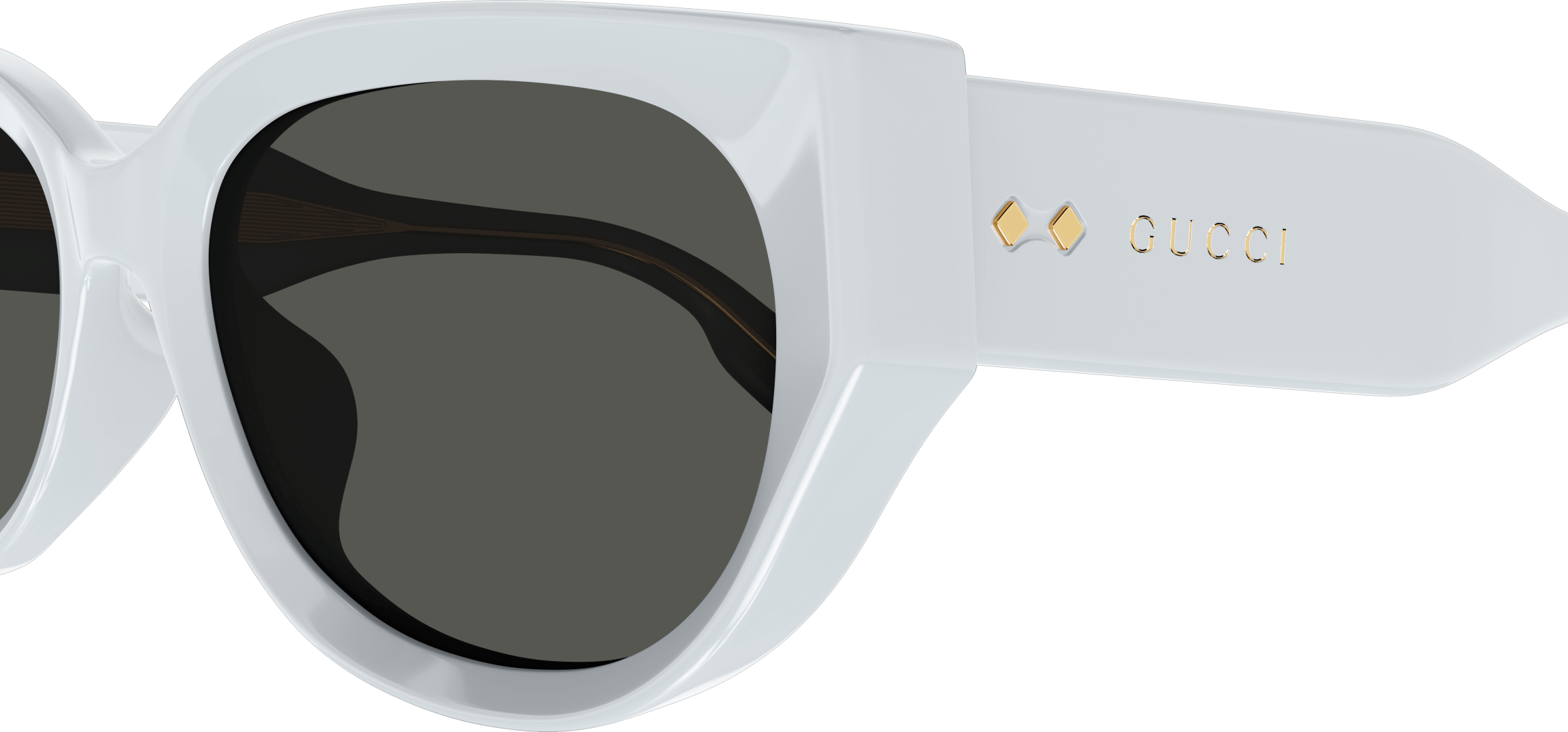 Thick and faceted acetate glasses that plays with volumes and geometries embellished with iconic rivets. Rounded cat eye bold acetate shape. Gold lettering logo engraved on the temple enriched by the iconic Gucci rivets. Feminine pastel color palette for a summerish look and feel.