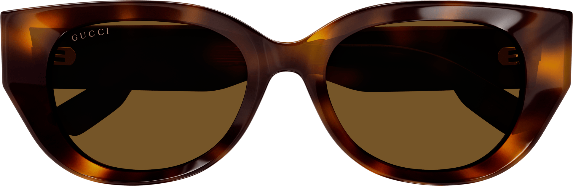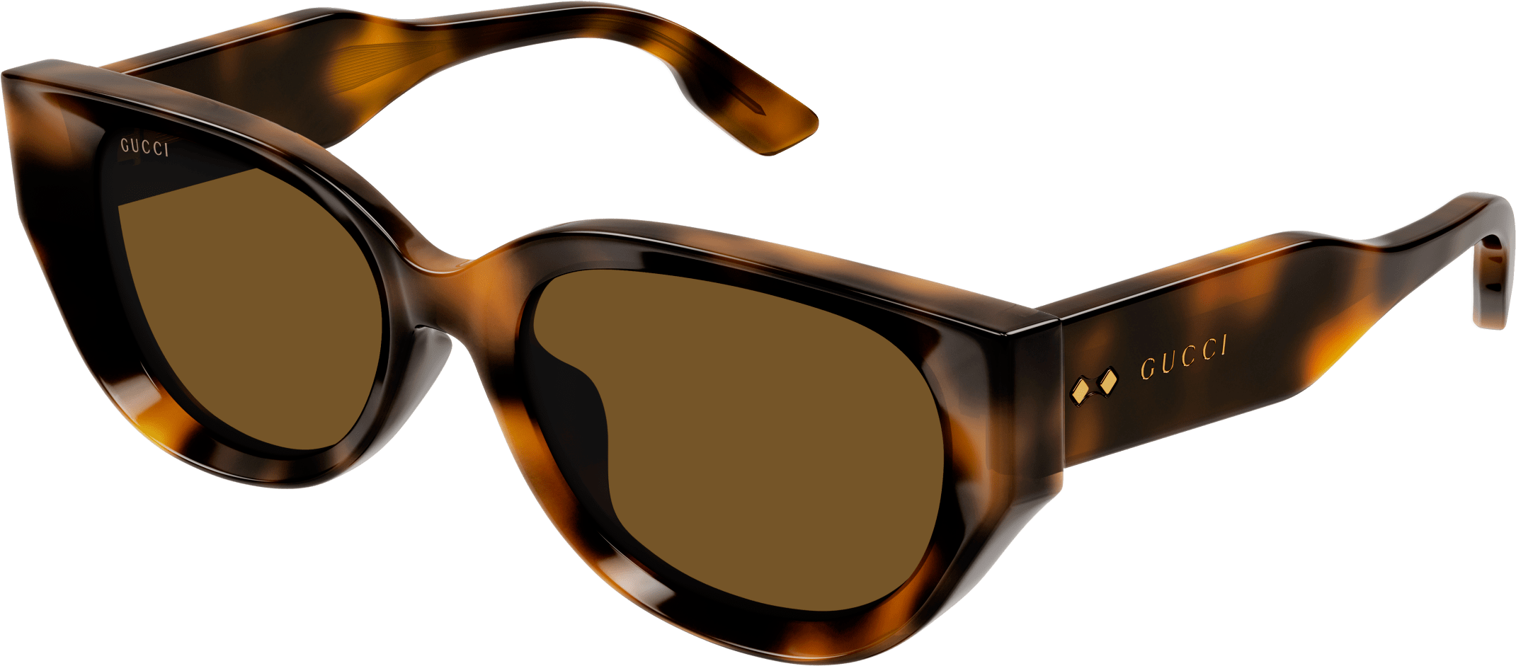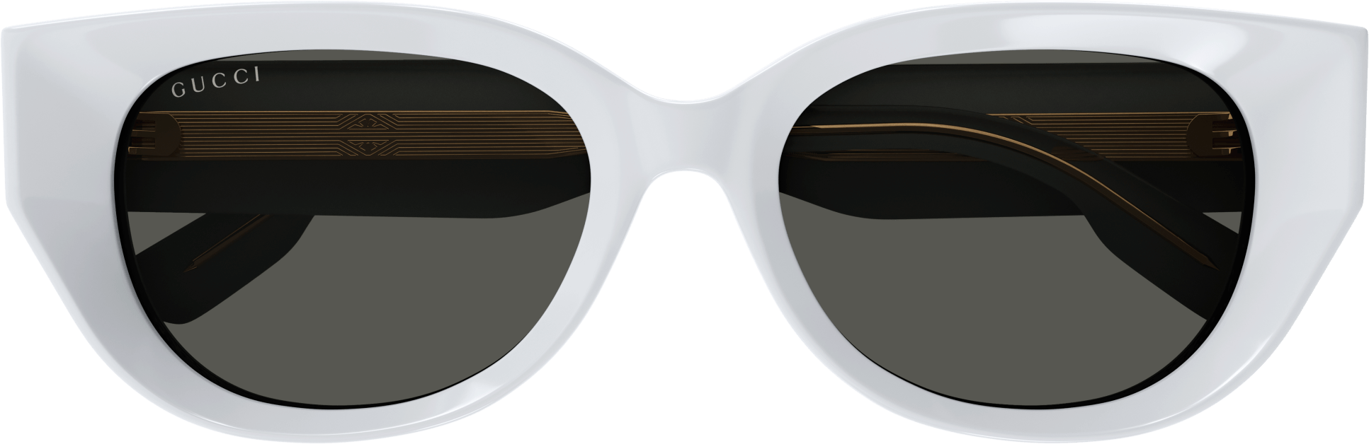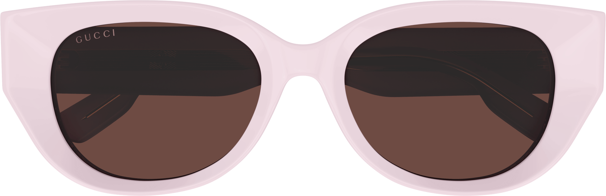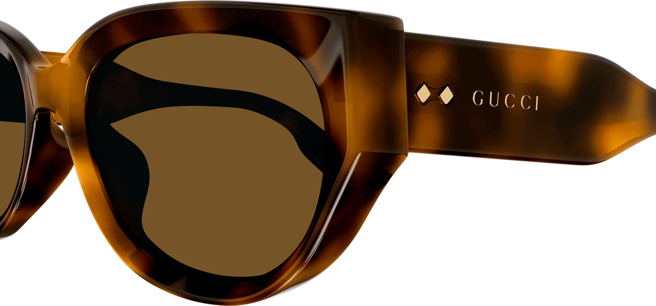 Thick and faceted acetate glasses that plays with volumes and geometries embellished with iconic rivets. Rounded cat eye bold acetate shape. Gold lettering logo engraved on the temple enriched by the iconic Gucci rivets. Feminine pastel color palette for a summerish look and feel.