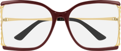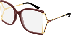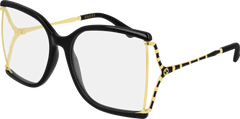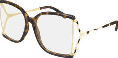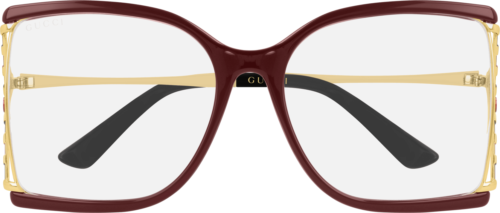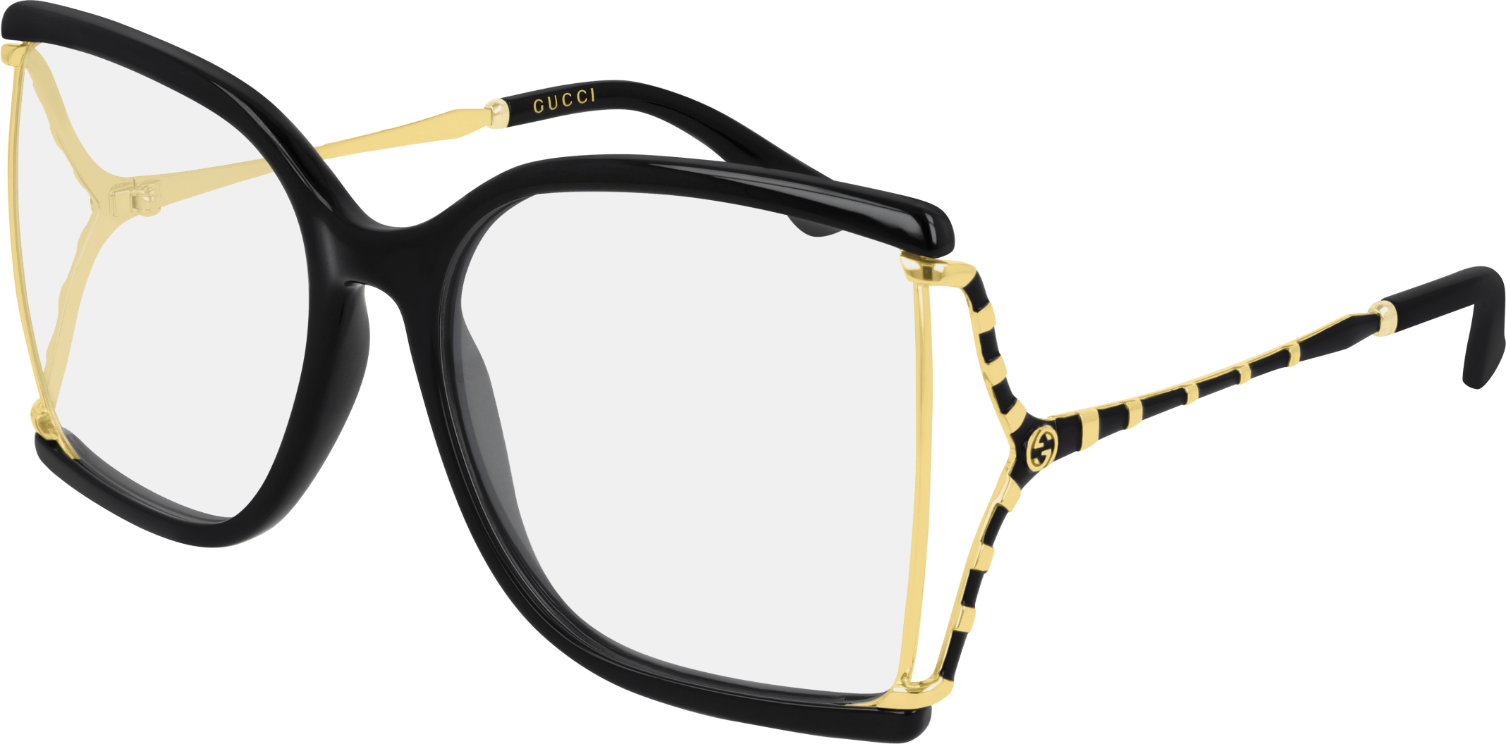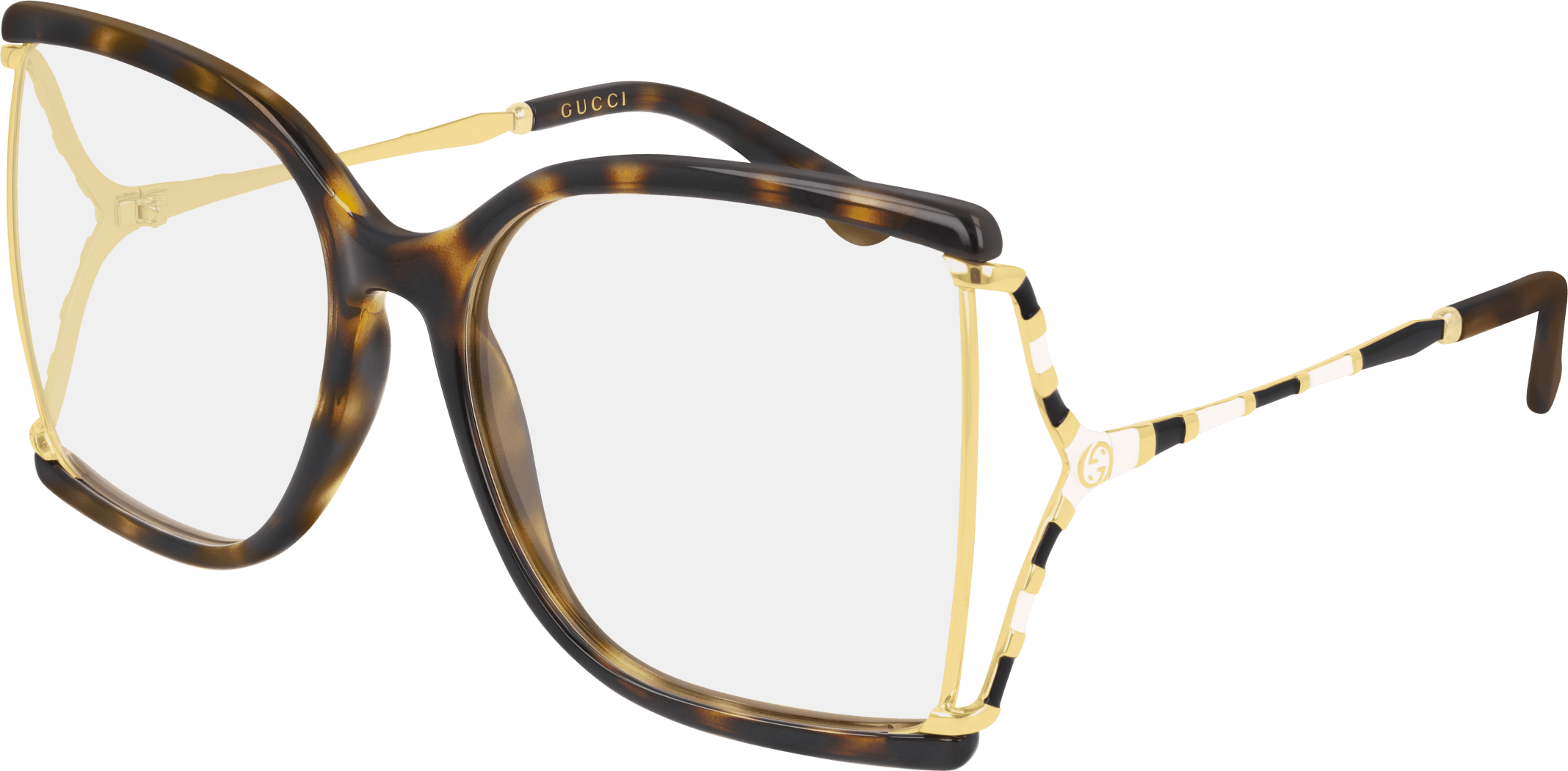 This butterfly oversize frame is characterized by the combination of a plastic and metal structure. Inspired by the iconic feminine glasses of the 70s is characterized by the metallic fork temple. The temples are decorated with zebra-striped motif recreated with different enamel tones recalling some patterns coming from Gucci glasses from the archive. Small GG interlocking logo on the hinges.