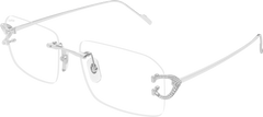 This precious execution of the C Décor icon is meticulously crafted in 18 ct white solid gold, embellished with real diamonds on the hinge detail. The Décor C detail serves as both a functional and aesthetic element, adorned with 108 diamonds of varying sizes. The rimless soft rectangular construction and clear lenses exude sophistication, offering a refined and elegant look.