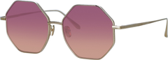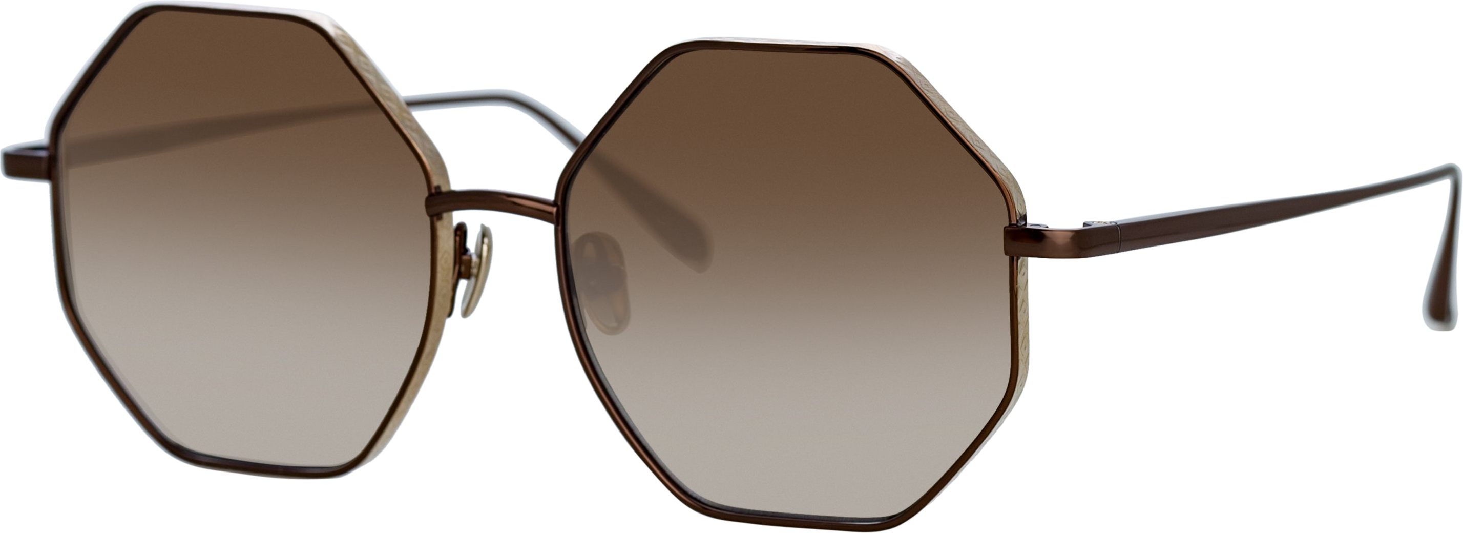LINDA FARROW brings signature design language to this hexagonal silhouette. The Japanese titanium frame is coated in a metallic brown with a contrasting shiny 22 carat light gold edge. The rim carries a delicately etched pattern inspired by elements in the natural world.